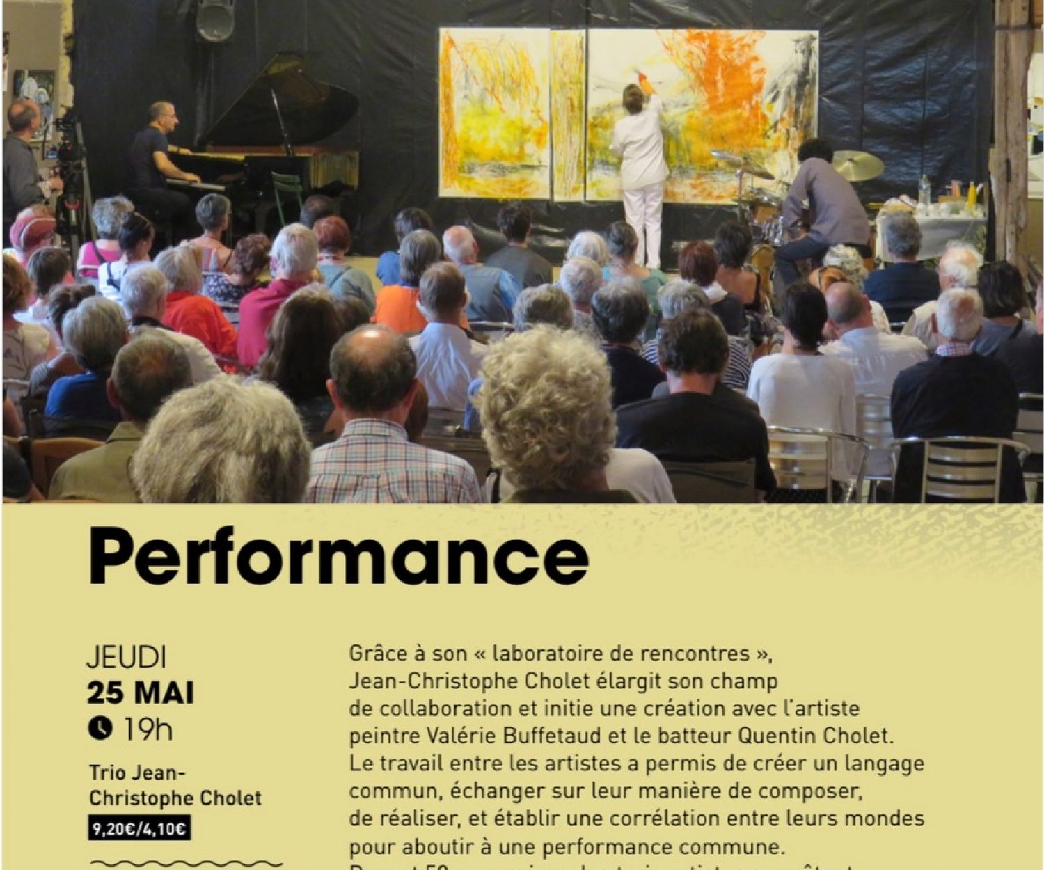 Actualités 17 Mai 2023 Performance le 25 mai à 19h Performance avec les Cholet le 25 mai prochain près d’Orléans. Peinture et Musique la Chapelle-Saint-Mesmin (45) - Espace Béraire Télécharger… valadmin