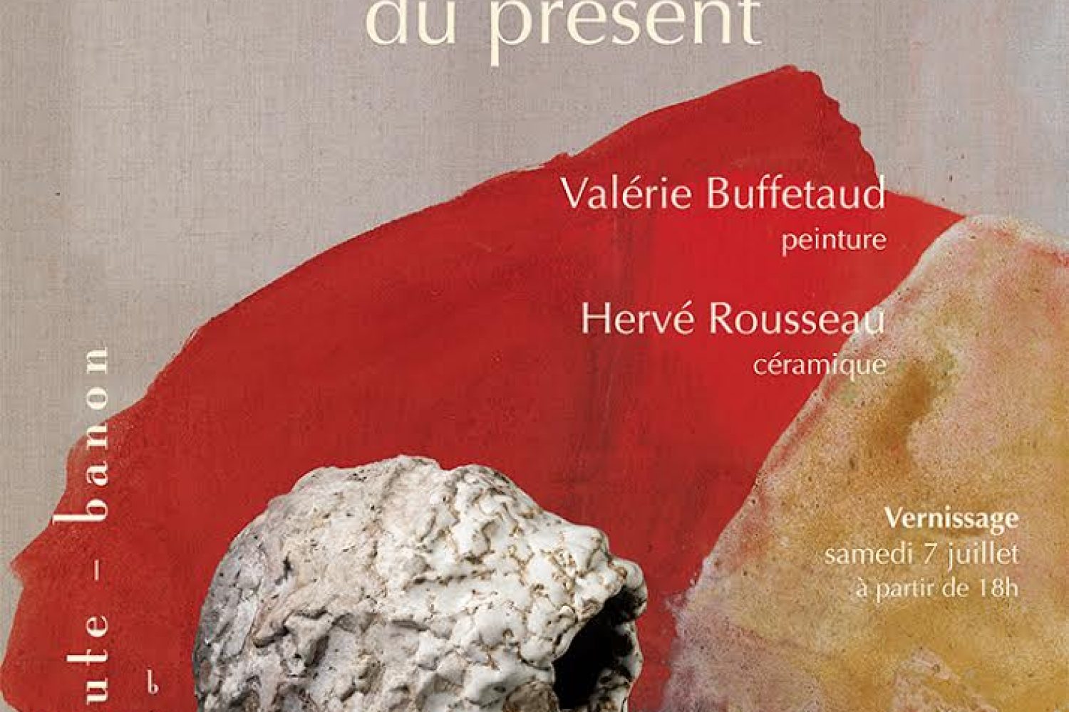 19 Juin 2018 valadmin Actualités 19 juin 2018 valadmin La tentation du présent La tentation du présent – exposition des peintures de Valérie Buffetaud et des céramiques d’Hervé Rousseau L’église haute à Banon (04) – tous les jours du 7 au 31 juillet de 10h30 à 19h VERNISSAGE: samedi 7 juillet à partir de 18h